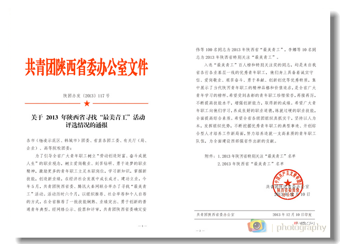 據(jù)了解,為了引導(dǎo)廣大青年員工樹立“勞動創(chuàng)造財富、奮斗成就人生”的職業(yè)觀念,樹立愛崗敬業(yè)、刻苦鉆研、勇于追夢的職業(yè)精神,激勵更多的青年員工立足本職崗位,創(chuàng)新發(fā)展,去年5月開始,共青團陜西省委、騰訊大秦網(wǎng)聯(lián)合舉辦了尋找“最美青工”活動。活動歷時六個月,以組織推薦、社會舉薦和個人自薦的方式,在全省推薦了一批技能嫻熟、業(yè)績突出、勇于創(chuàng)新的普通青年典型。經(jīng)網(wǎng)絡(luò)公示、投票和評審,最終確定了10名特別關(guān)注“最美青工”和100名陜西省“最美青工”,黃亞光同學榮獲“最美青工”和特別關(guān)注“最美青工”兩項榮譽。